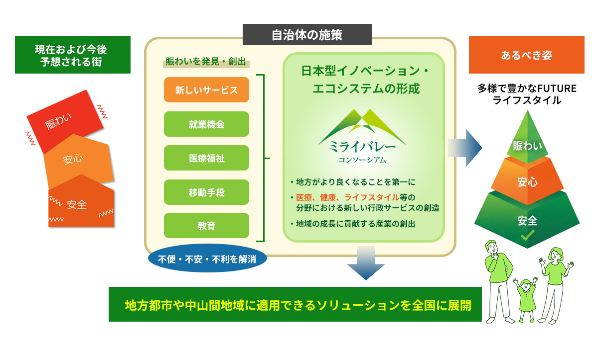 本コンソーシアムは、地方都市がより良くなることを第一に考え、医療・健康・ライフスタイル等の分野における新しい行政サービスの創造と地域の成長に貢献する産業の創出を可能にし、日本型イノベーション・エコシステムの形成と地方創生の実現を目指します。