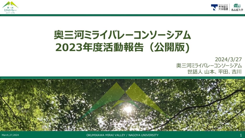 2024.07.12 お知らせ 2023年度活動報告・第1回奥三河ミライバレーコンソーシアム総会資料を掲載しました 2023年度活動報告・第1回奥三河ミライバレーコンソーシアム総会資料を掲載しました。 資料一覧は、活動紹介ページ内の、年間活動報告のセクションをご覧ください。