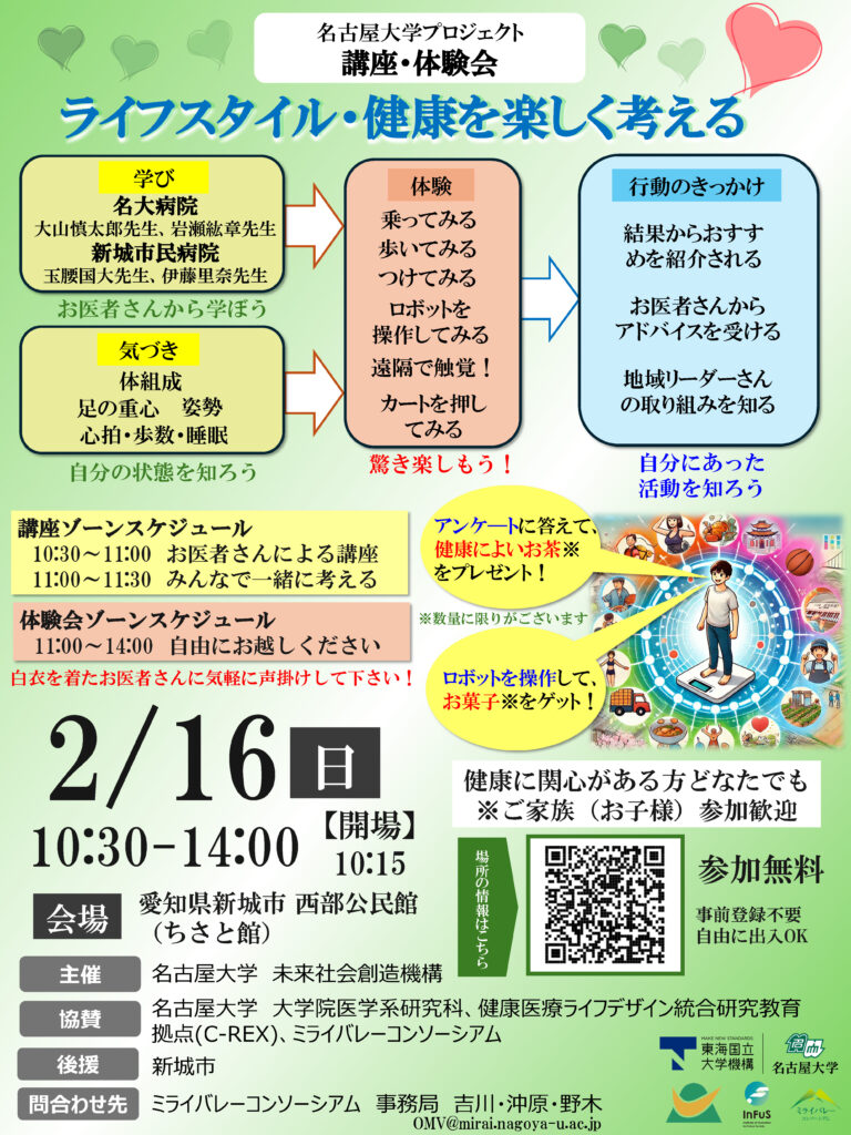 名古屋大学主催・新城市後援「ライフスタイル・健康を楽しく考える」講座・体験会が新城市西部公民館にて開催されます。ミライバレーコンソーシアムはこのイベントを協賛しています。